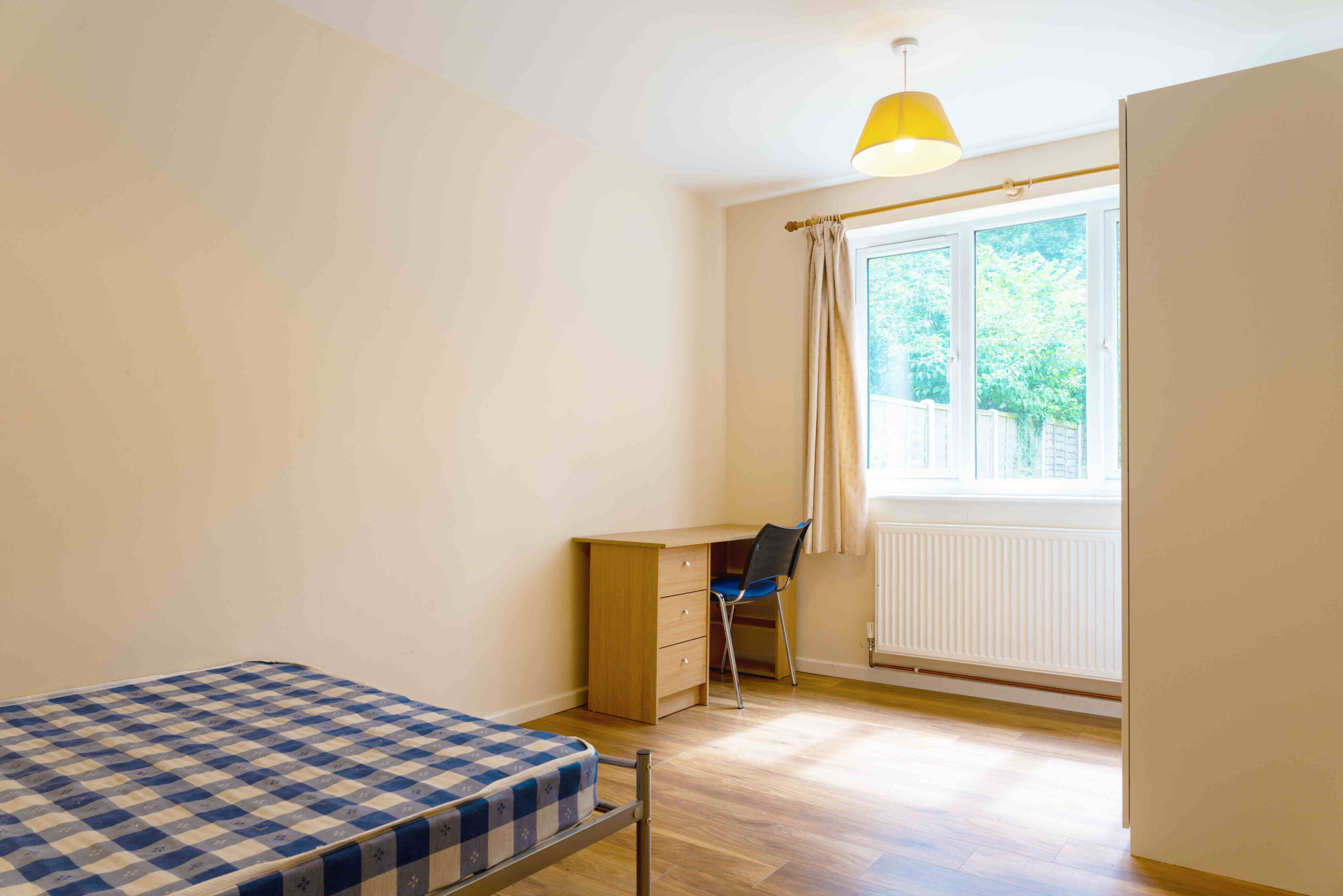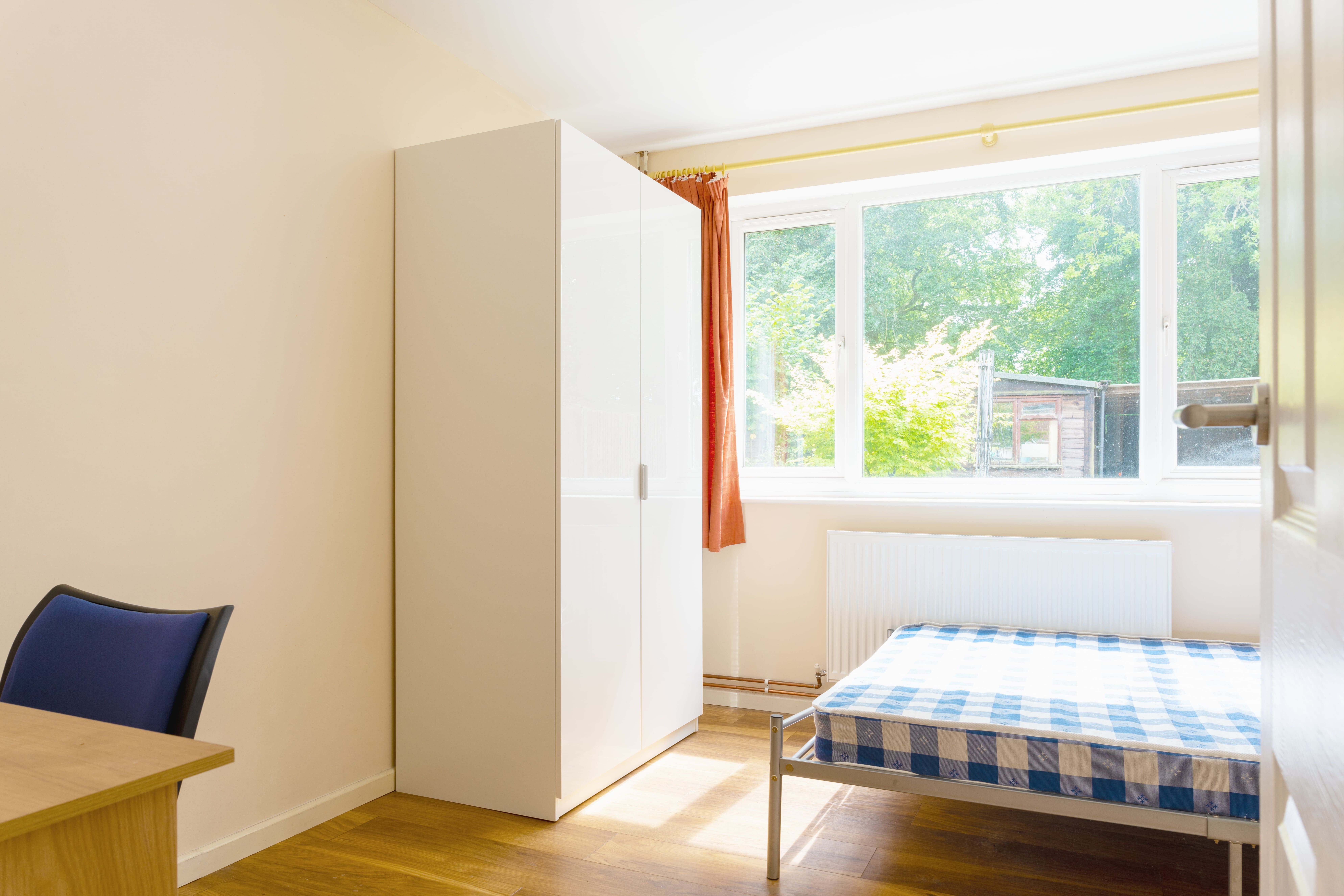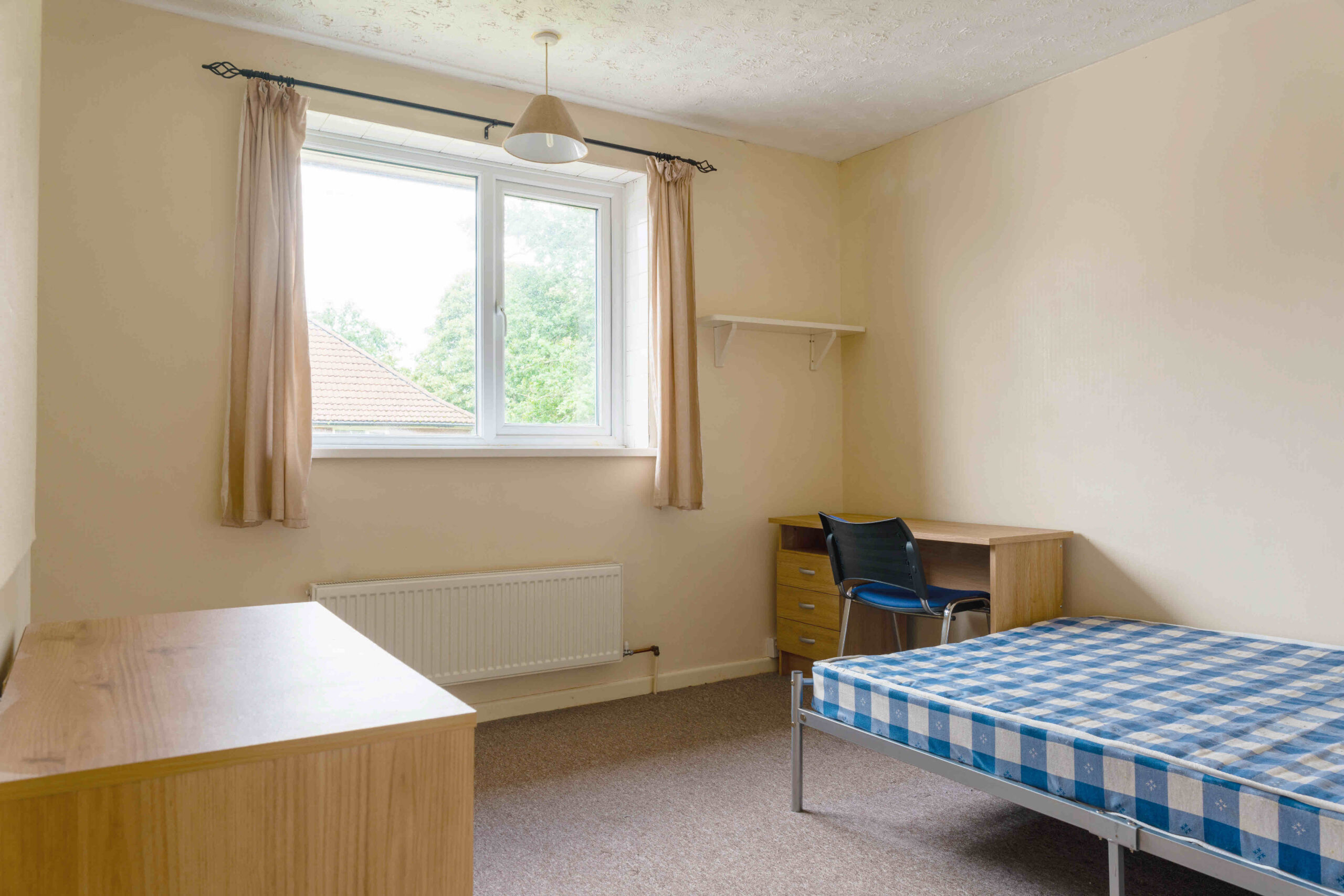 Each bedroom furnished with double bed, desk, chair and either free standing wardrobe or built in wardrobe with free standing chest of drawers.