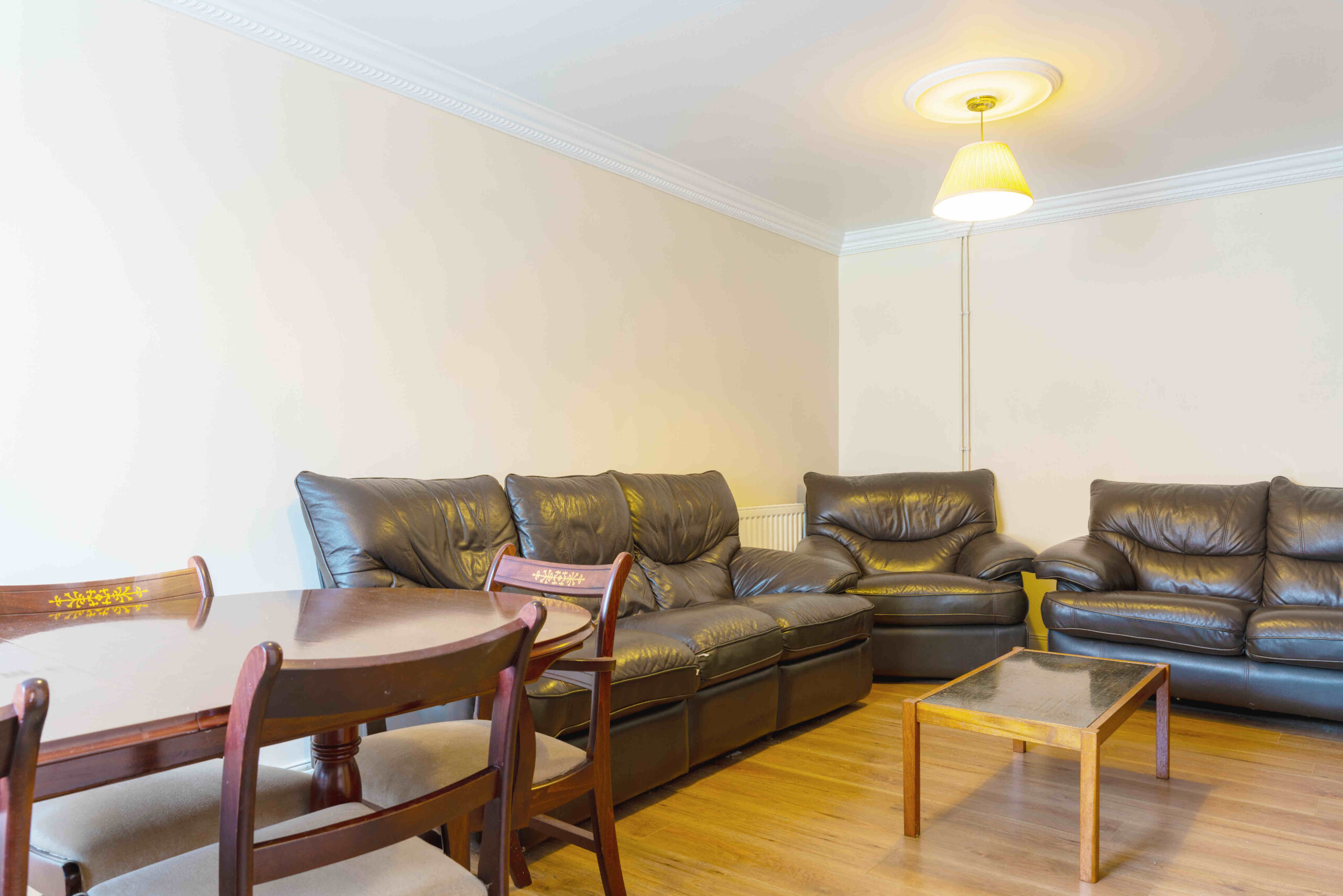 The Lounge/Diner has been retained at its full size and offers a comfortable seating area with sofas and a 50" smart TV, along with a dining table and chairs.