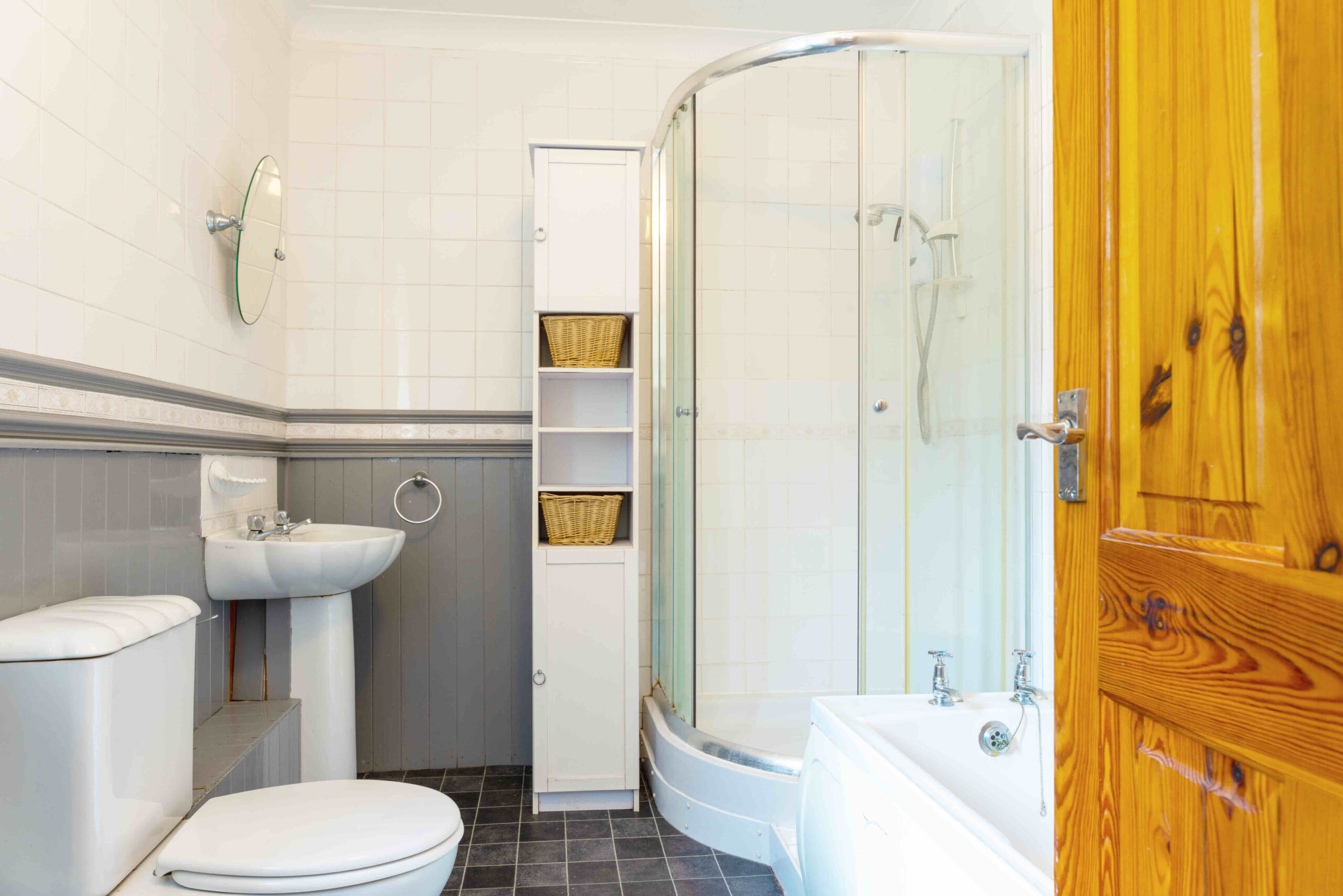 Upstairs family bathroom with shower over and sink.